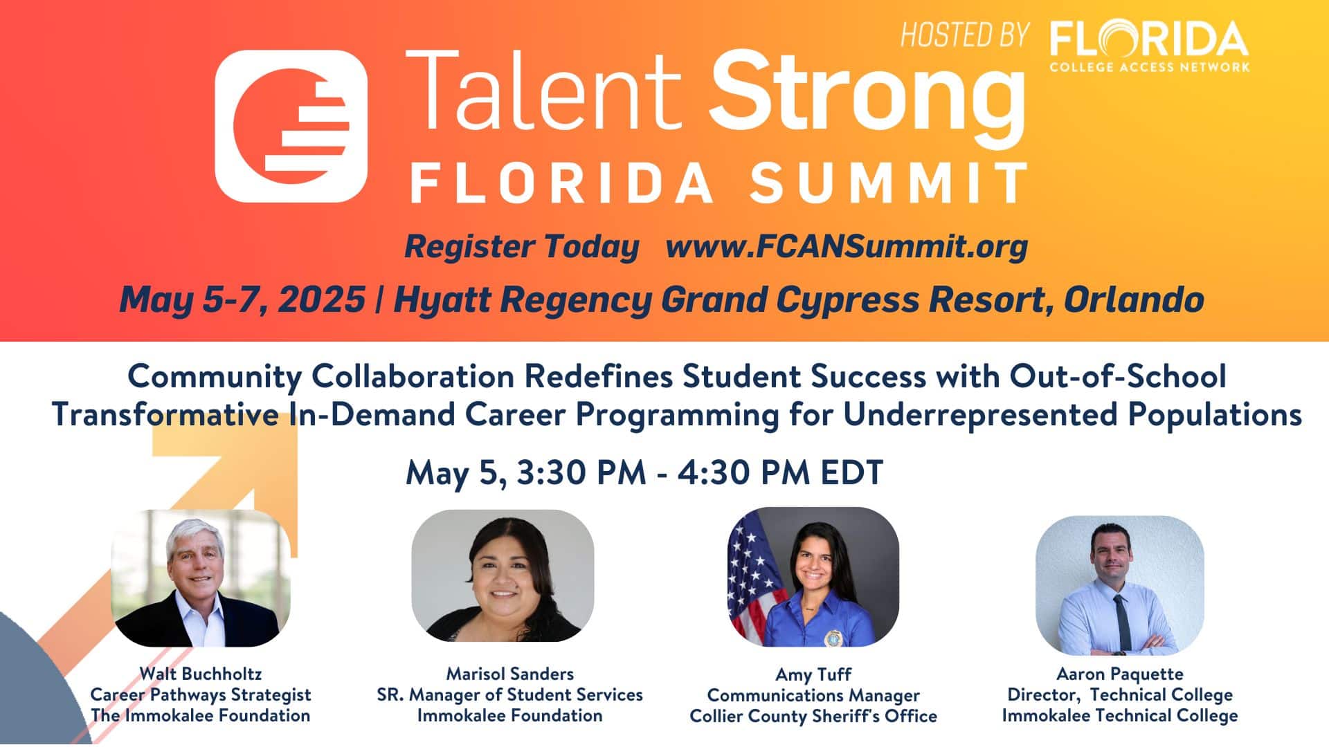 At Florida College Access Network’s (FCAN) Talent Strong Florida Summit (May 5-7, 2025, at the Hyatt Regency Grand Cypress Report in Orlando), leaders from The Immokalee Foundation will showcase how strategic community collaboration fosters student success, strengthens Florida’s workforce, and fuels economic growth.