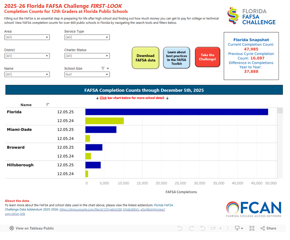 To support Florida leaders in responding to these trends, FCAN has launched the First-Look FAFSA Dashboard, which tracks FAFSA submissions and completions by state, school, school district and, for the first time, by House and Senate districts. Counselors, district leaders, higher education partners, and legislative staff can monitor progress and target efforts to boost FAFSA completion rates statewide. Counselors can identify which seniors haven’t completed the FAFSA; district leaders can compare progress across schools and this first-time tracking by House and Senate districts will allow legislators to see weekly FAFSA completion trends in their districts.