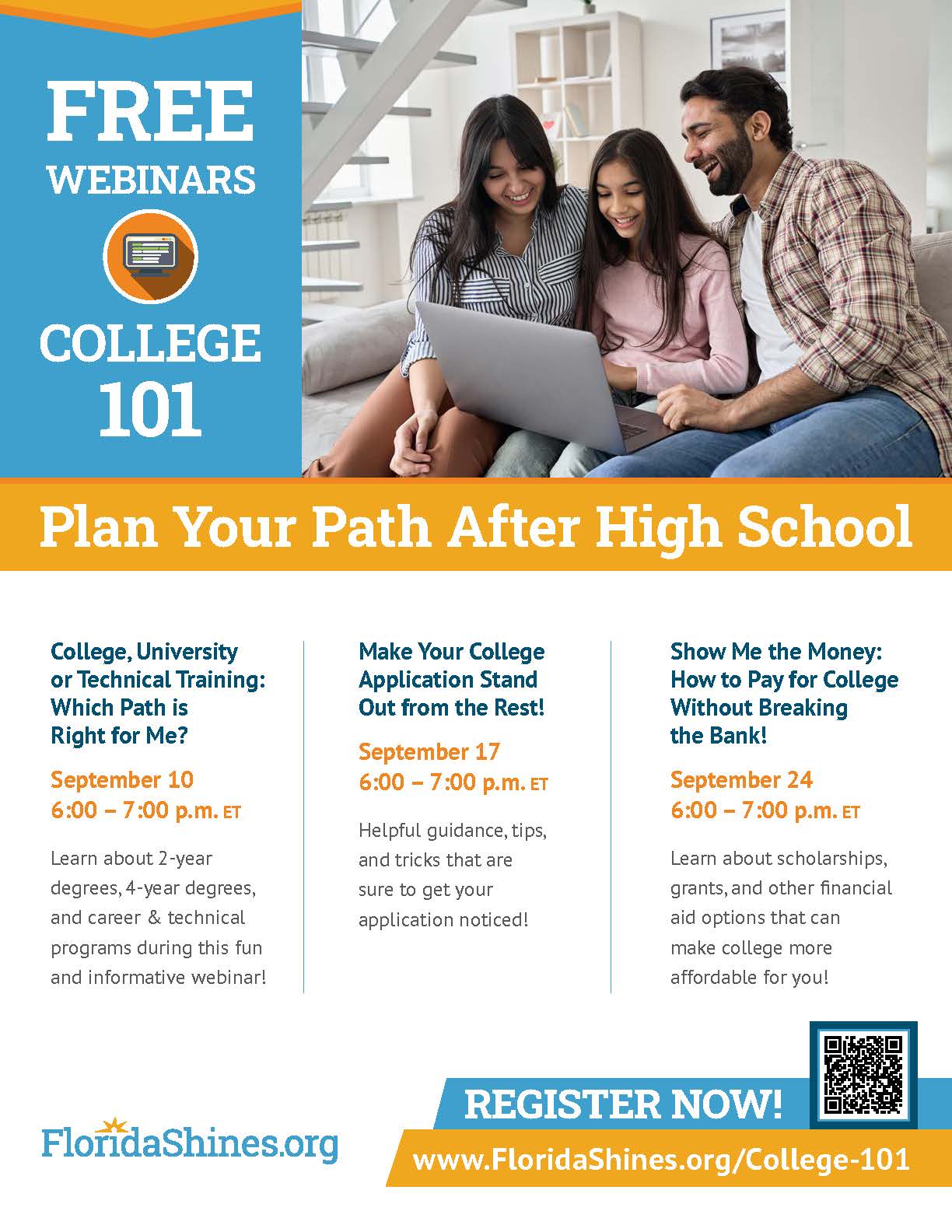 Three virtual sessions titled “College 101” will focus on key steps in the college-going process for students. The series, scheduled throughout September, will be hosted on the FloridaShines webpage in collaboration with various statewide partners.