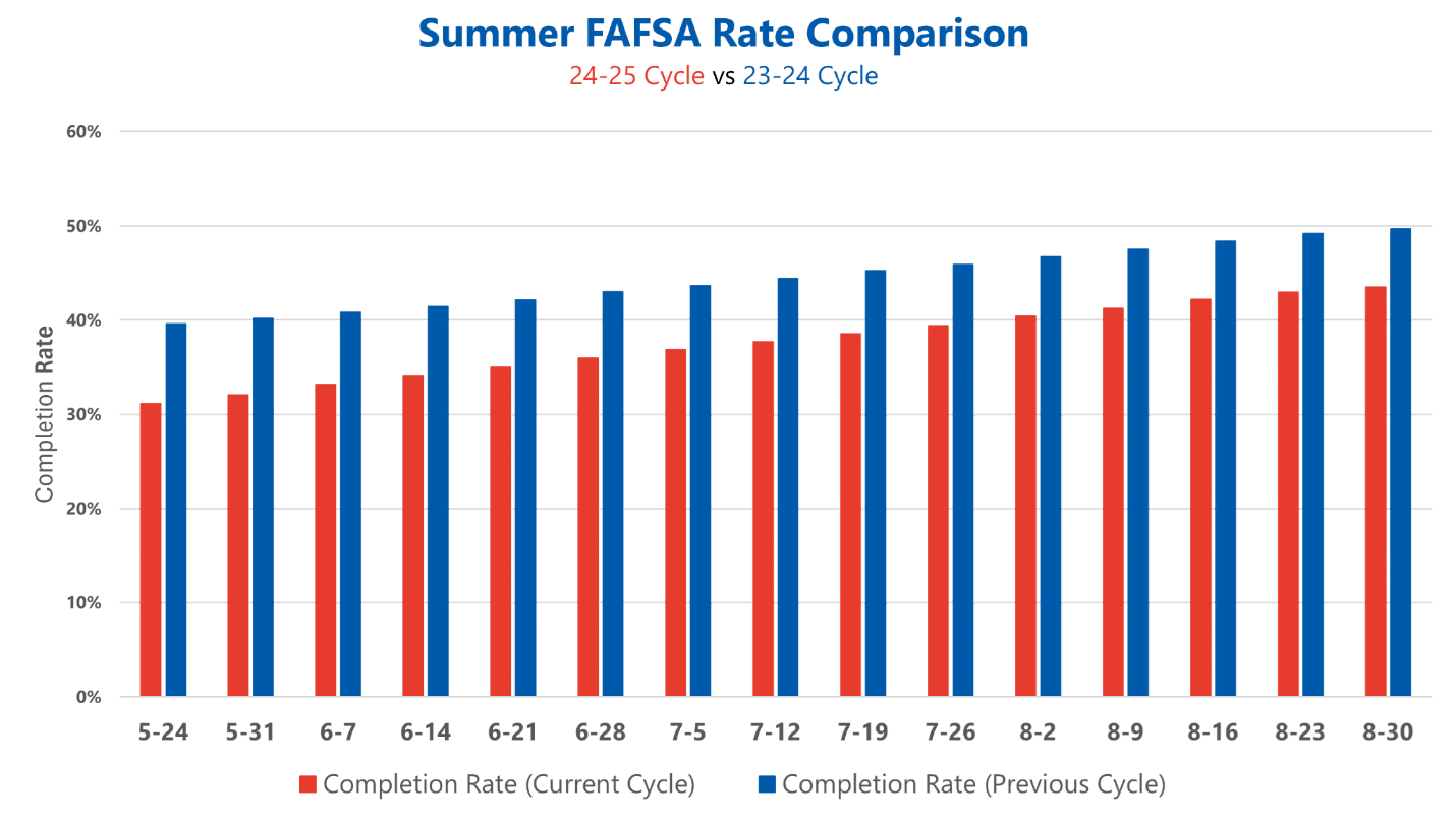 Florida also exhibited a greater week-to-week growth rate this summer, as evidenced by the sharper red slope in the figure above. Average week-to-week FAFSA growth for the current 24-25 cycle’s summer months was 2.4%, trumping last year’s value of 1.6%.