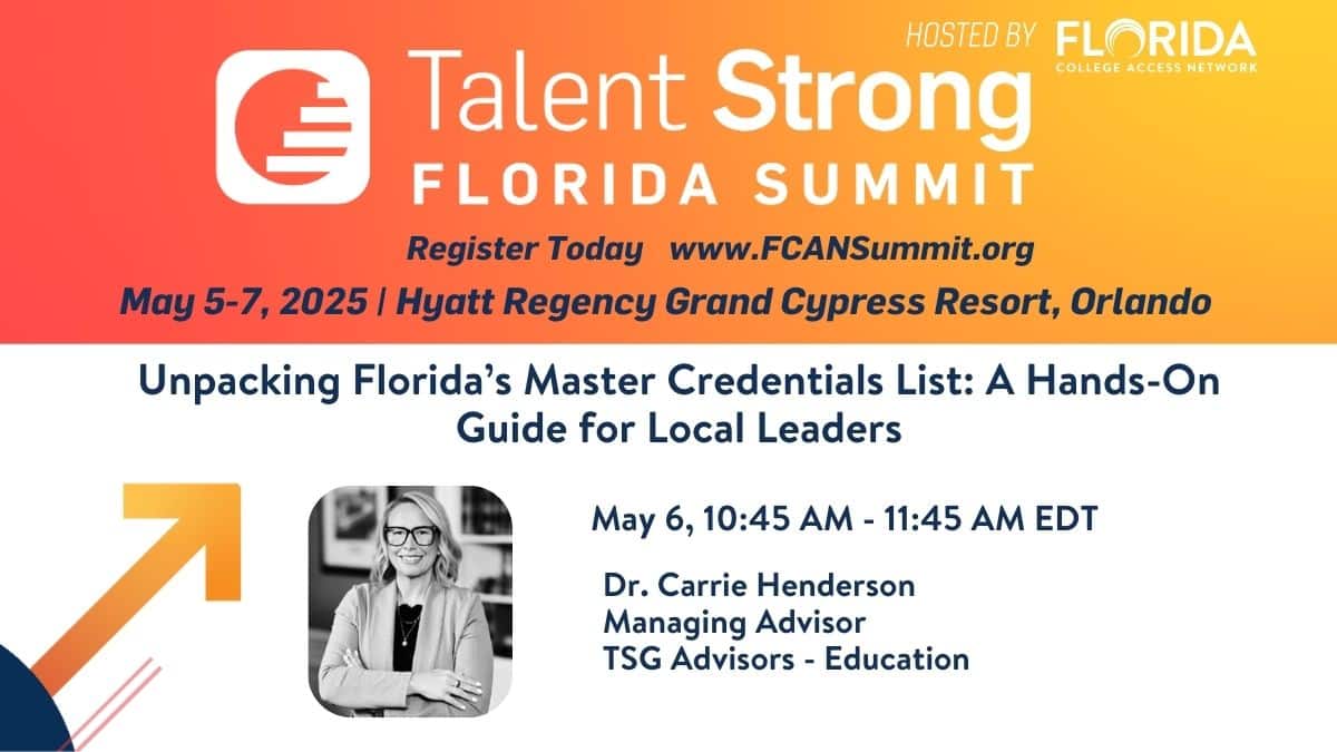 Dr. Carrie Henderson, Managing Advisor at TSG Advisors – Education, will lead the session “Unpacking Florida’s Master Credentials List: A Hands-On Guide for Local Leaders.” The session will explore the Florida Master Credentials List (MCL)—a powerful tool designed to align educational programs with high-value workforce needs across the state.