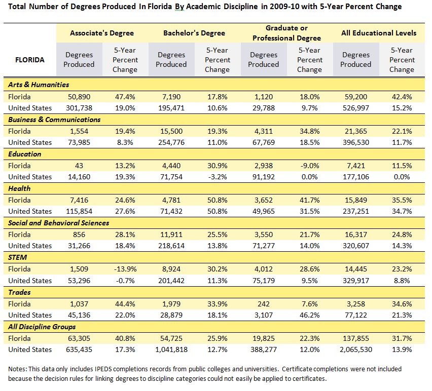 This trend, SHEEO says, suggests that both student choice and institutional degree production are being influenced by higher wage premiums. There is one exception, however, which is STEM. Although nationally, STEM is the second highest paying discipline at the baccalaureate level, degree production was only up 11.3% over the five year span from 04-05 to 09-10, below the national average. In Florida however, STEM degree production continued to expand at an impressive 30.2%. 4-year STEM graduates in Florida earn $55,879 annually on average and $62,606 nationally.