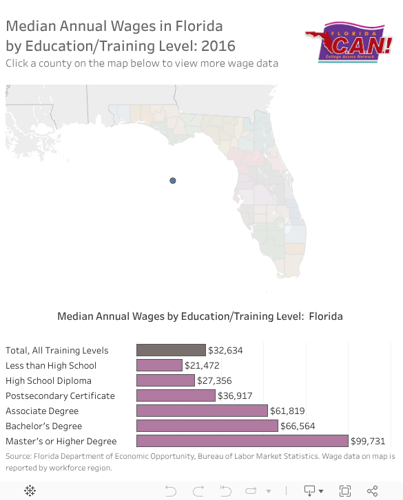 Florida College Access Network has released a new, interactive data dashboard that allows users to search median annual wages for Florida workers by education and training level.