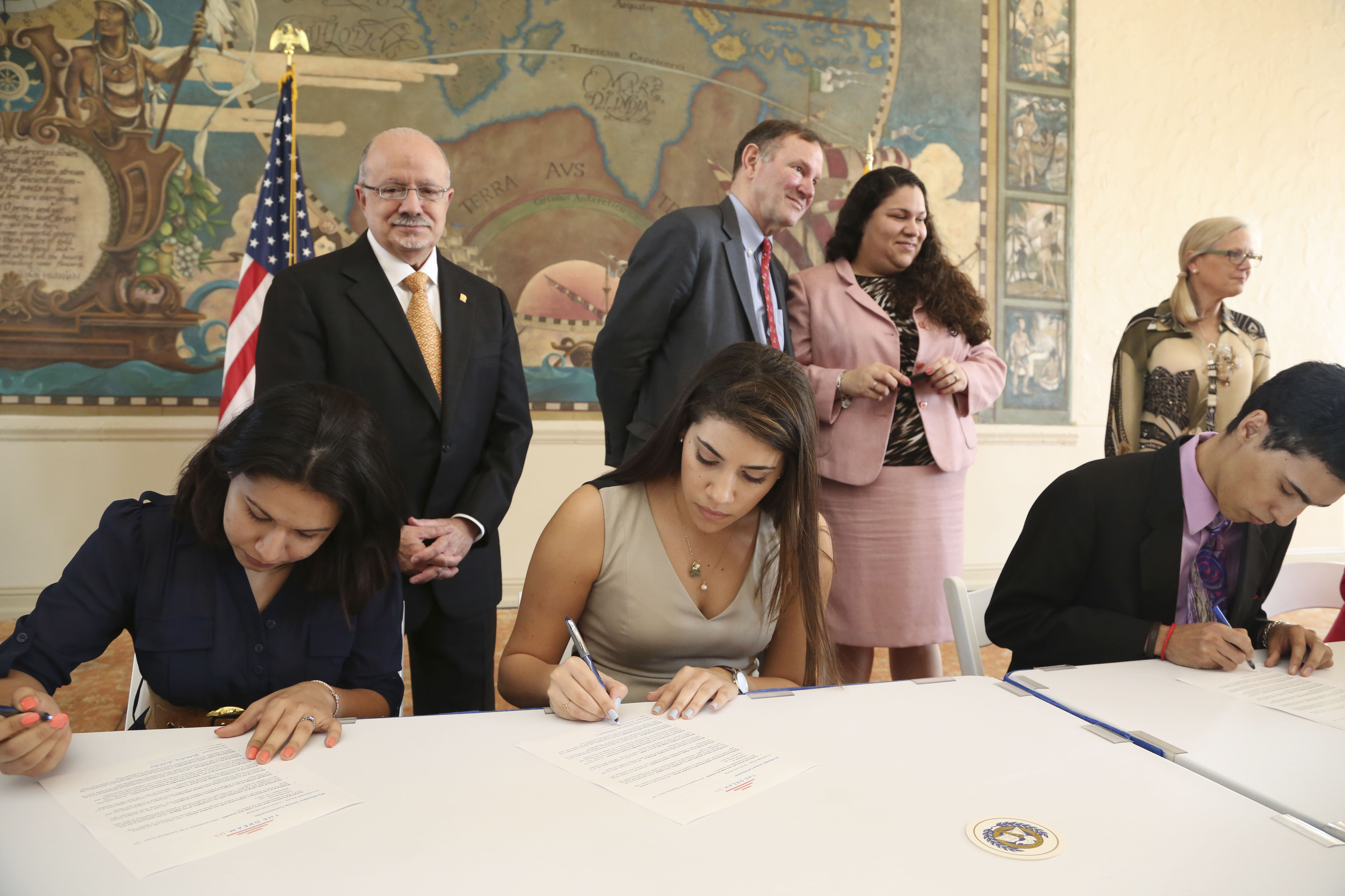 PHOTO: MDC DREAMer students sign their scholarship agreements while MDC President Dr. Eduardo J. Padrón, TheDream.Us founder Donald E. Graham, DREAMer Gaby Pacheco and TheDream.Us President Candy Marshall look on.