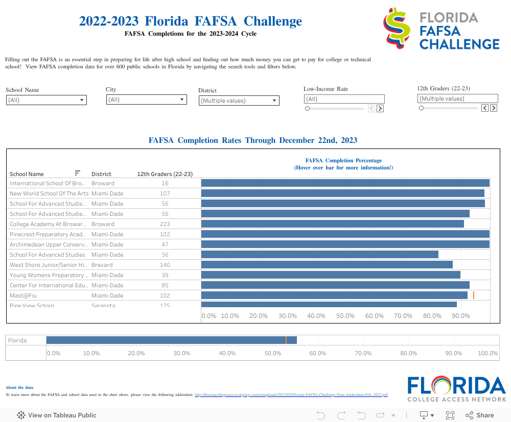 Register your school, district, or organization for the Florida FAFSA Challenge here. Registered schools receive special updates, tips for success, stickers to pass out to students, and other supports. To learn more about the Challenge, visit the Statewide Initiatives page.